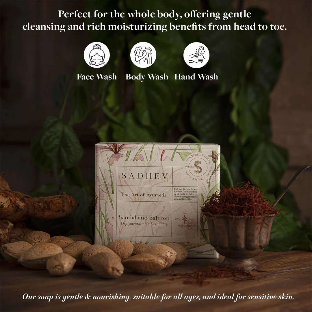 Sadhev’s Sandal & Saffron Bathing Bar is lovingly handcrafted using pure Sandalwood from the estates of Mysore and Red Saffron that is carefully extracted within 24 hours of harvest from the valleys of Kashmir. This luxurious blend of Sandal & Saffron helps provide an even toned radiance and a luminous afterglow to the skin.