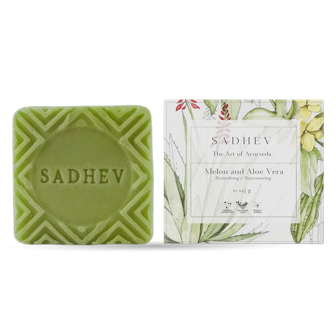 Sadhev’s Melon & Aloe Vera Bathing Bar is infused with the rich essence of Sweet Almond Oil and Wheat Germ Oil that naturally reawakens the skin into a soft bloom. This exquisite soap has a natural granulated loofah within the soap to help exfoliate your skin. Vetiver granules are sprinkled into the soap. These granules settle on one side creating a truly unique soap perfect for exfoliation and hydration.