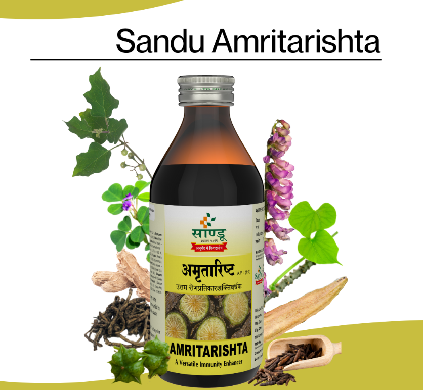 SanduAmritarishta is an excellent Ayurvedic immunity booster medicine. It helps build your immunity through its complex composition. It is enriched with Amrita (Guduchi) and Dashmool which provide various benefits such as boosting and improving immunity and digestive activity. It also has anti-viral, anti-inflammatory, analgesic, adaptogenic, antioxidant & neuroprotective properties. Being cholagogue it excretes out bile and corrects Liver & Spleen health. It increases Haemoglobin levels in the body. The ayurvedic tonic for immunity is bitter owing to the presence of Guduchi and is packed in glass bottles to preserve the quality and efficacy of the medicine.