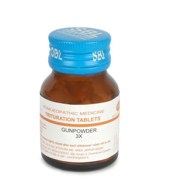 SBL's Gunpowder Trituration Tablet, characterized as a black or brown explosive substance, is a unique homoeopathic remedy known for its remarkable properties in addressing various health issues. Comprising a mechanical mixture of potassium nitrate (saltpeter), charcoal, and sulfur. It has having antiseptic action, enhancing the blood's ability to eliminate disease germs. In low potency, Gunpowder serves as an excellent blood purifier, aiding in the restoration of health.