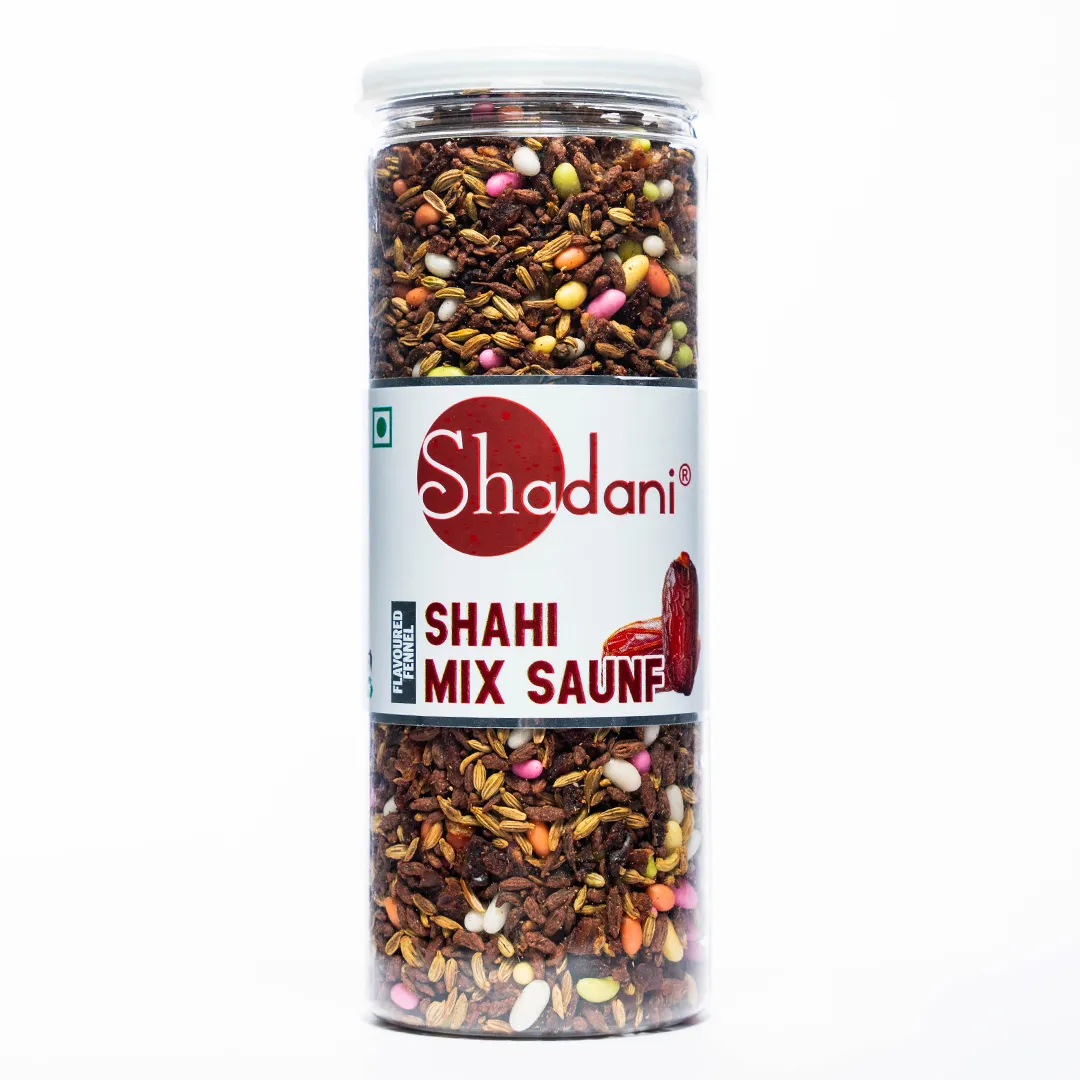 Shadani Shahi Mix Saunf is a luxurious mouth freshener that combines tradition with indulgence. This exquisite blend features handpicked fennel seeds, roasted dry dates, and aromatic chirmi leaves, delicately coated with menthol and natural paan flavors. Every spoonful of this Shahi Mukhwas delivers a refreshing burst of sweetness and crunch, making it a perfect conclusion to your meals or a delightful treat anytime. Whether you're hosting guests, traveling, or enjoying a quiet moment, Shahi Mix Saunf offers a rich, royal snacking experience that refreshes the palate and uplifts the senses.