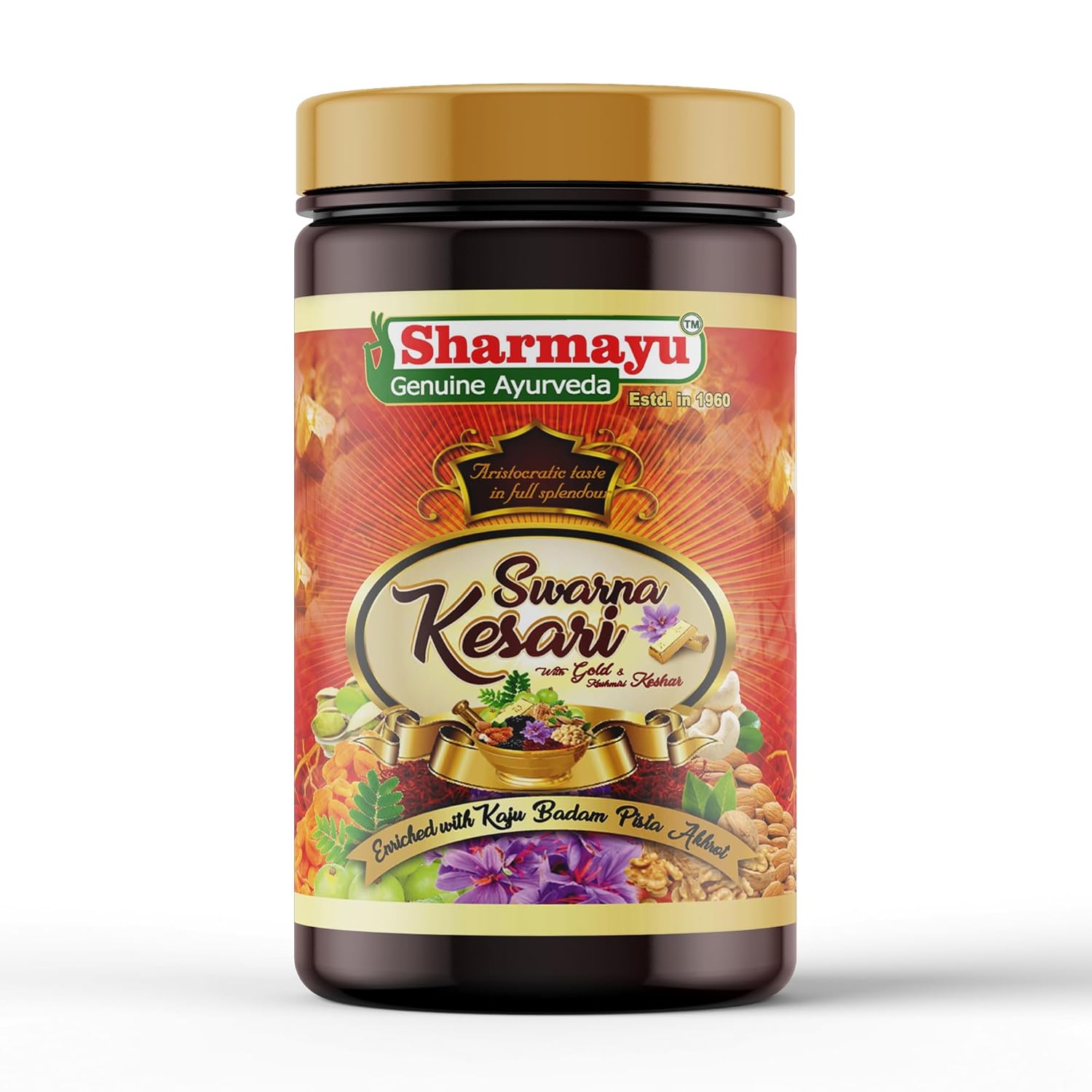 SwarnKesari is a comprehensive herbal tonic powered with Gold, Keshar, and 38 Ayurvedic herbs making it a powerful Rasayana which aims at maintaining youthfulness, vigor, the vitality of the body and keeping away aging process, senility and debility. It maintains the proper functioning of the cells and rejuvenates the cells. As such it also keeps away diseases. It maintains the proper functioning of the cells and rejuvenates the cells. As such it also keeps away diseases. Swarna KesariSupereme is an ayurvedic preparation made out of Kashmiri Kesar from the Himalayas Pure Gold and Afghani meva, like-almond mingei, pistachio mingei, raisins, and Nut Mingei are major inclusions in this ayurvedic tonic.