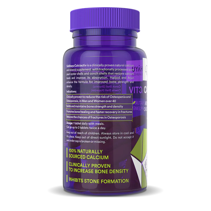 Calciactiv is an advanced calcium supplement, a complete bone-health management therapy. Clinically proven and 100% natural, it combines pure, traditionally-processed pearl oyster shell, conch shells with the Hadjod, and Arjuna herbs. This carefully balanced mix of calcium and minerals maximizes calcium absorption and restores calcium levels.