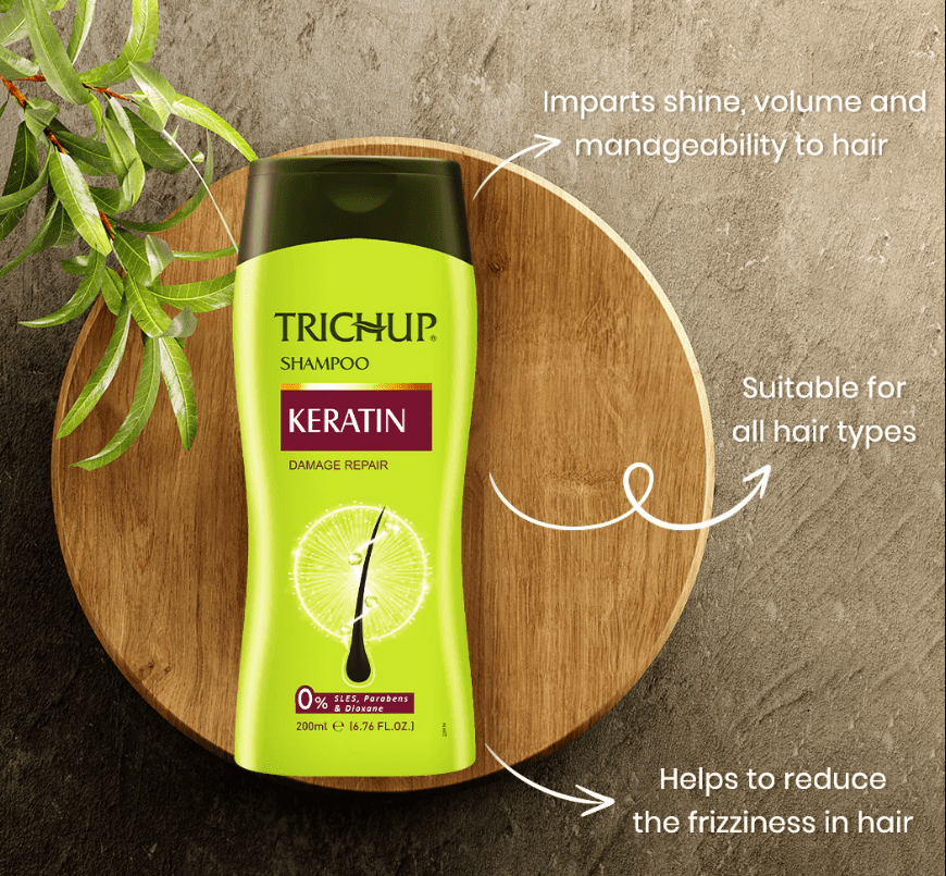 Keratin is a kind of protein in hair, which provides strength, flexibility, and softness. Trichup Keratin Shampoo is fortified with Keratin protein, which forms a layer over the hair replacing the lost Keratin and rebuilds the strength, returns elasticity, and reduces breakage. It also contains suitable conditioners to leave hair healthy, shiny, and frizz-free.