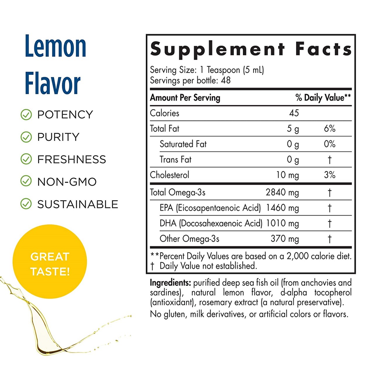 | Ingredients: Purified deep sea fish oil (from anchovies and sardines), natural lemon flavor, d-alpha tocopherol, rosemary extract (a natural preservative). |