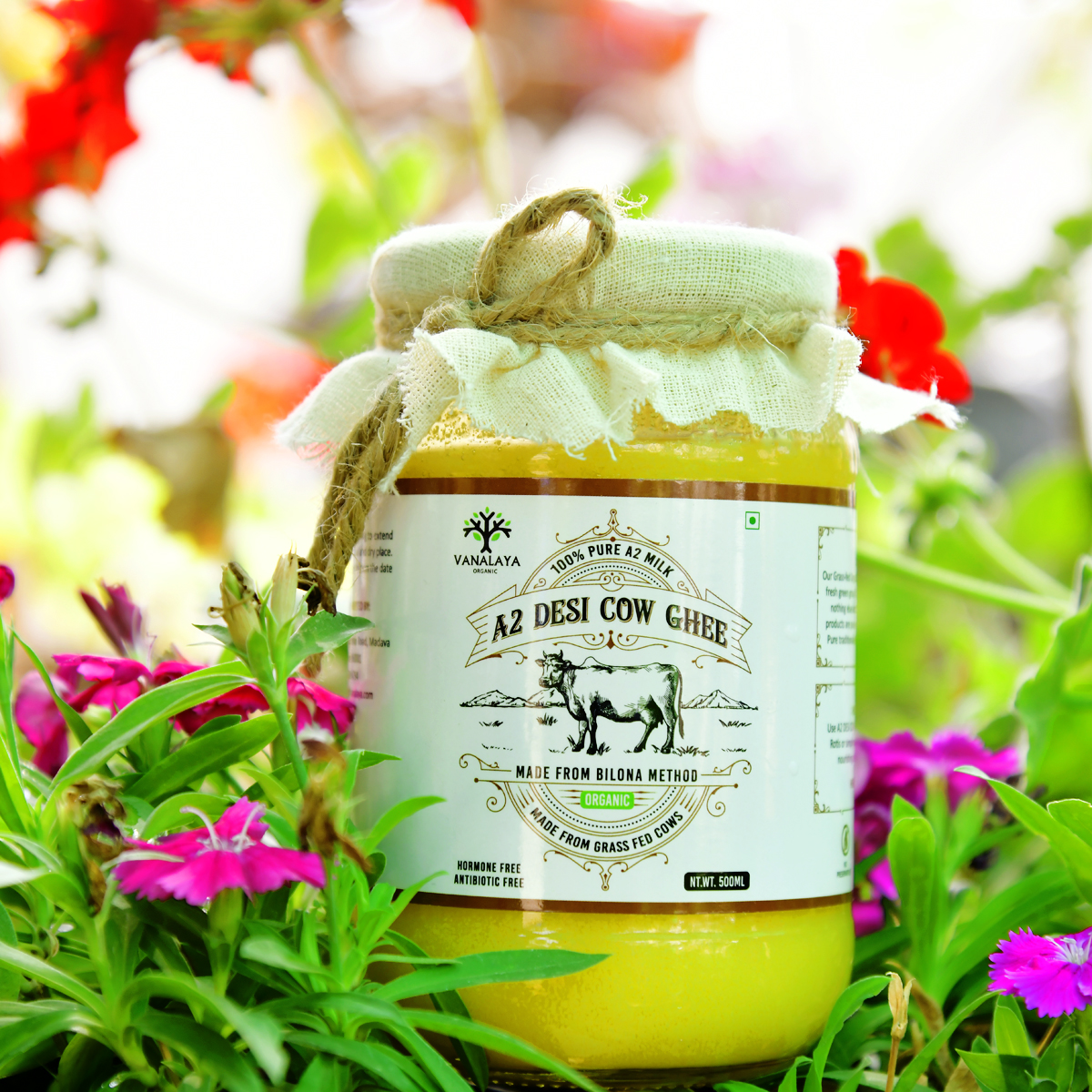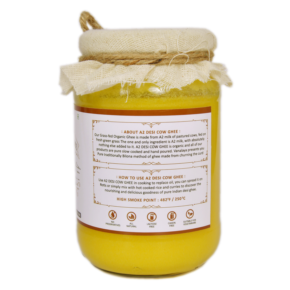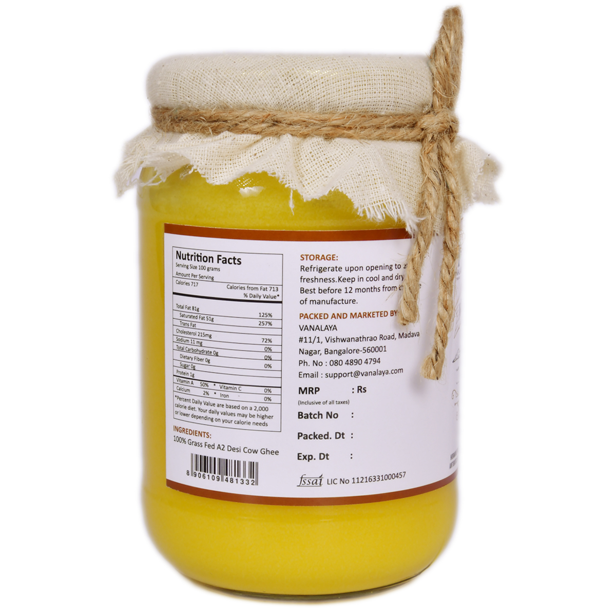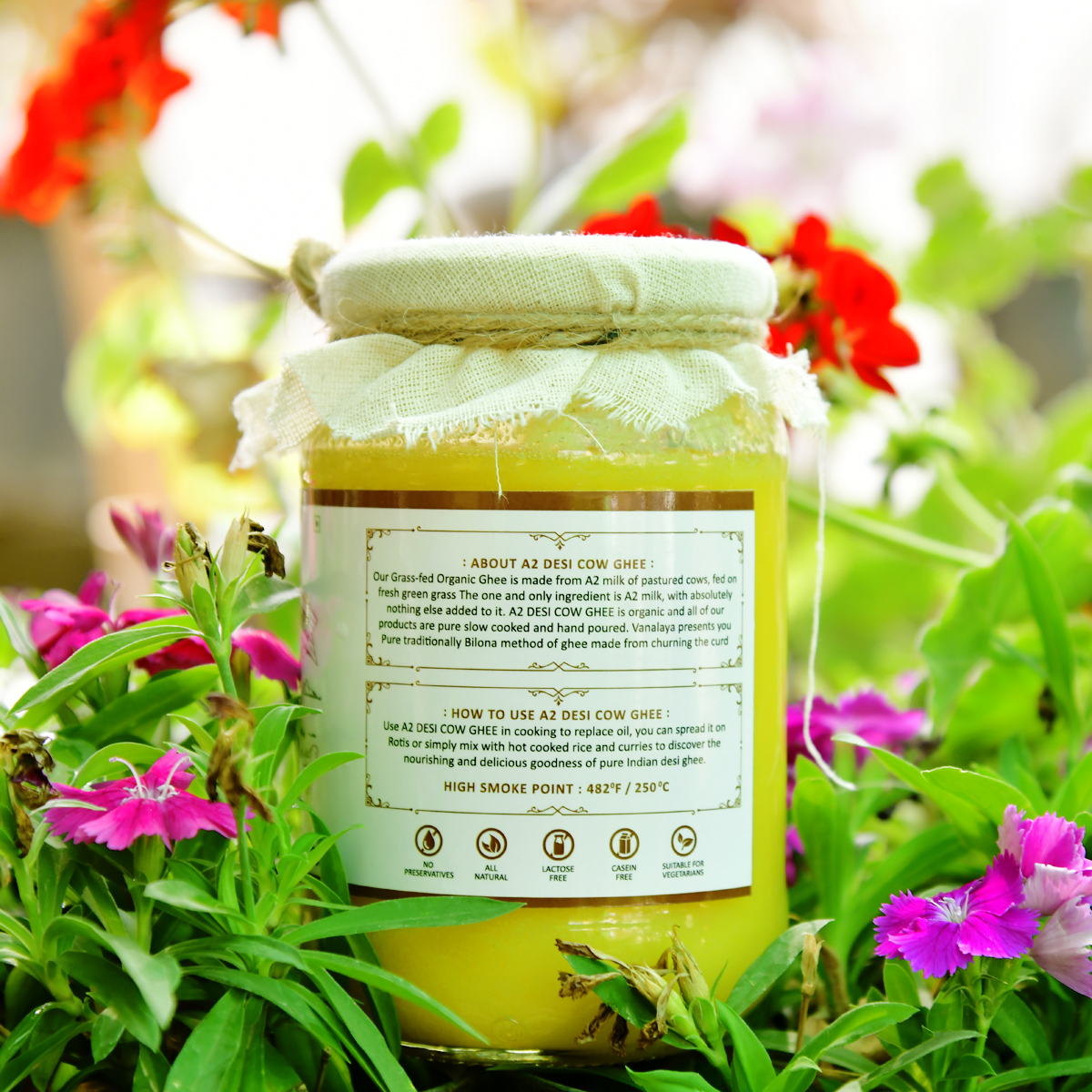 Vanalaya follows a traditional hand churning method to prepare pure ghee from A2 milk of desi cows. Our Grass-fed Organic Ghee is made from A2 milk of pastured cows, fed on fresh green grass. The one and only ingredient is A2 milk, with absolutely nothing else added to it. A2 Desi Cow Ghee is organic and all of our products are pure slow cooked and hand made. Vanalaya presents to you Pure traditionally Bilona method of ghee made from churning the curd. Using the traditional hand churned Bilona Padathi, our Desi A2 Milk Cow Ghee is made true to the ancient Vedic method of ghee production “Bilona Padathi”. This gives it the rich aroma and flavour that you expect from Desi Ghee. This A2 ghee has ayurvedic benefits and is an excellent fat for your Keto Diet. Our cows are grass fed true to ancient processes of cow rearing and milk production from desi cows.