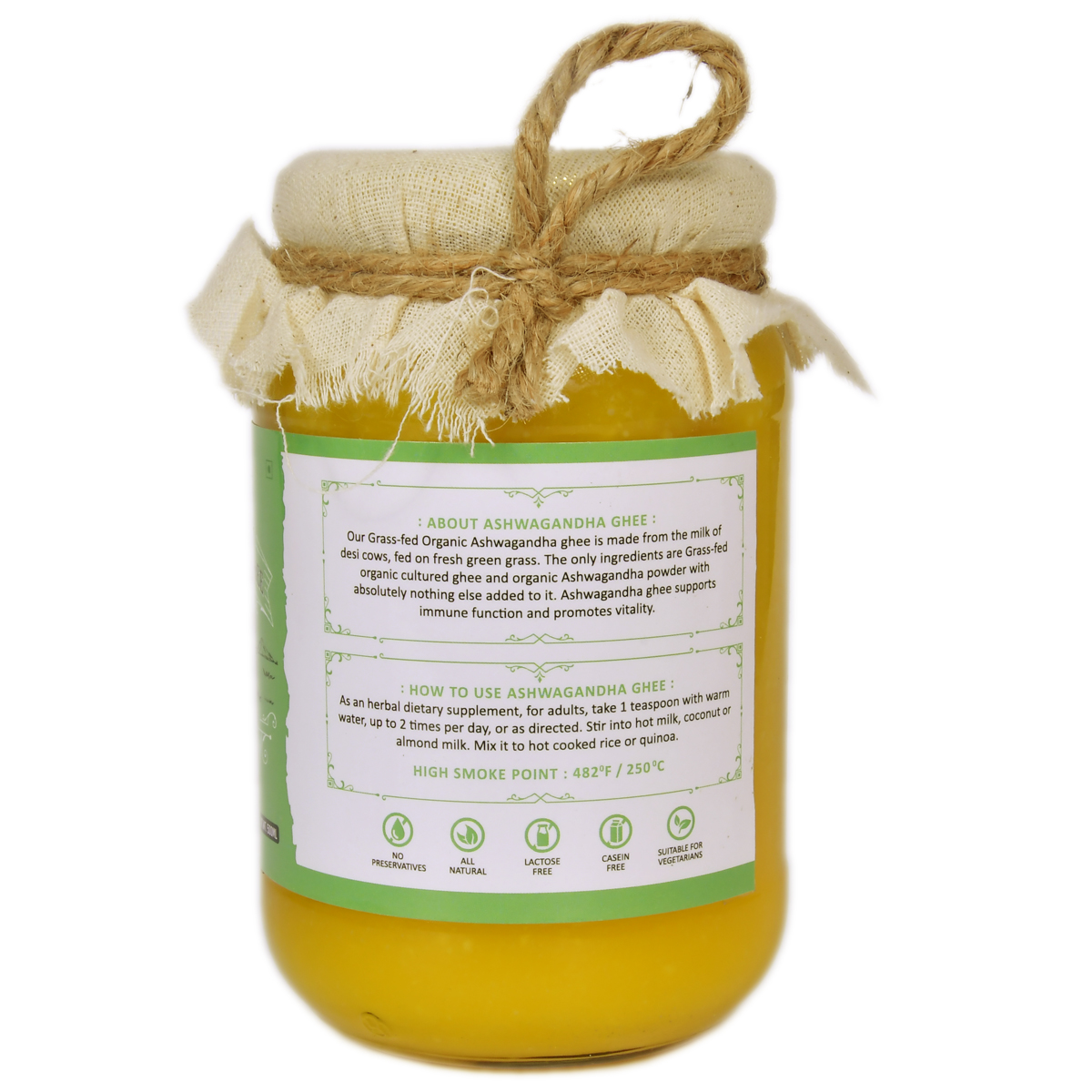 Our Grass-fed Organic Ashwagandha ghee is made from the milk of desi cows, fed on fresh green grass. The only ingredients are Grass-fed organic cultured ghee and organic Ashwagandha powder with absolutely nothing else added to it. Ashwagandha Ghee calms the nervous system and is believed to reduce anxiety or stress. Ashwagandha Ghee promotes the health of the adrenal system that manages the body’s response to environmental, physical and emotional stress. Ashwagandha has high levels of antioxidants which fight signs of aging such as wrinkles, dark spots, fine lines, and blemishes.