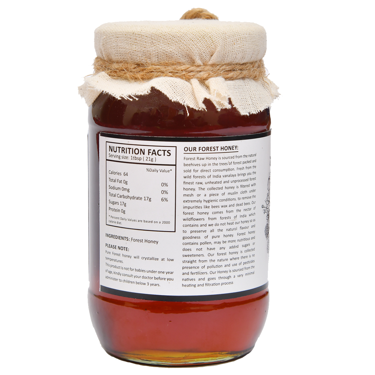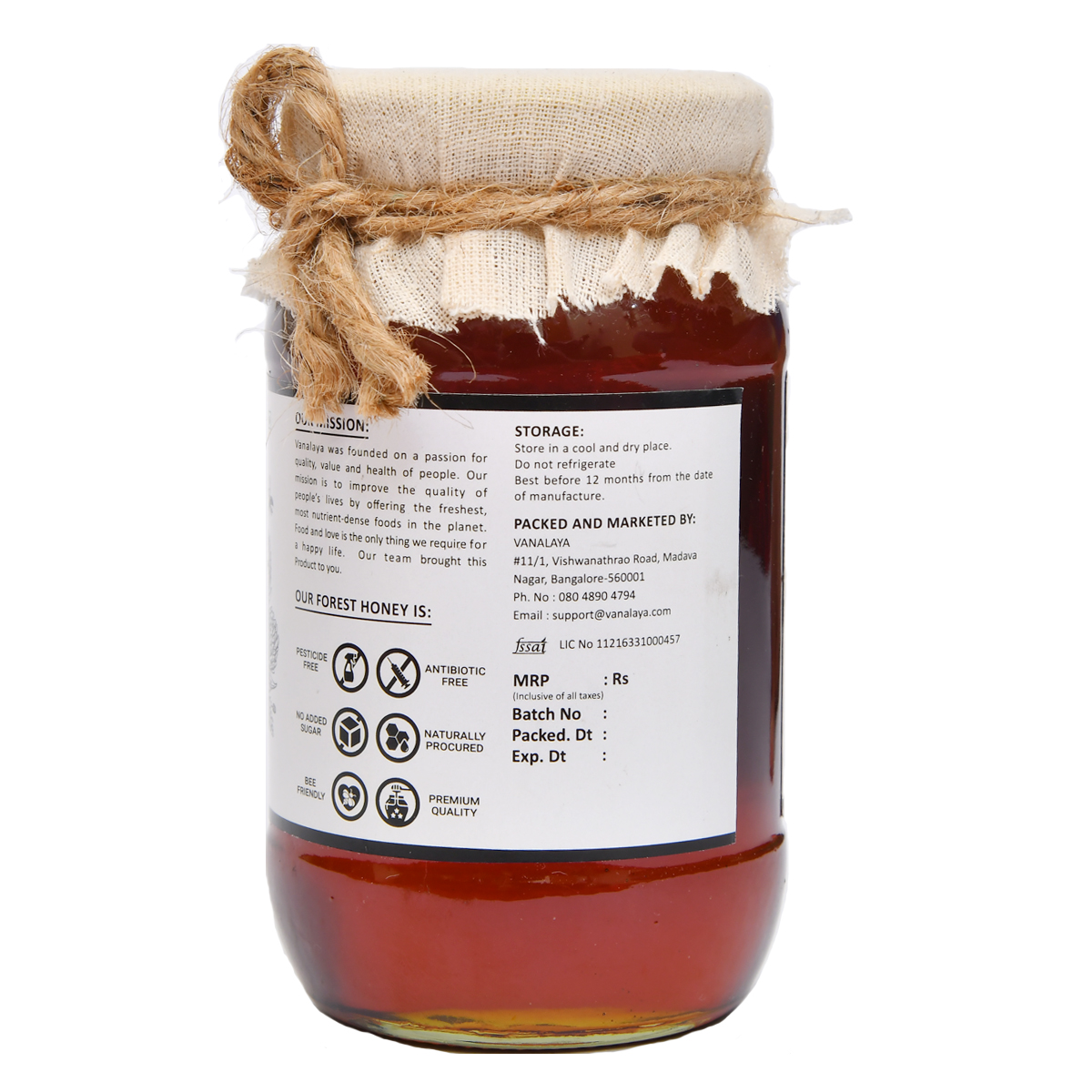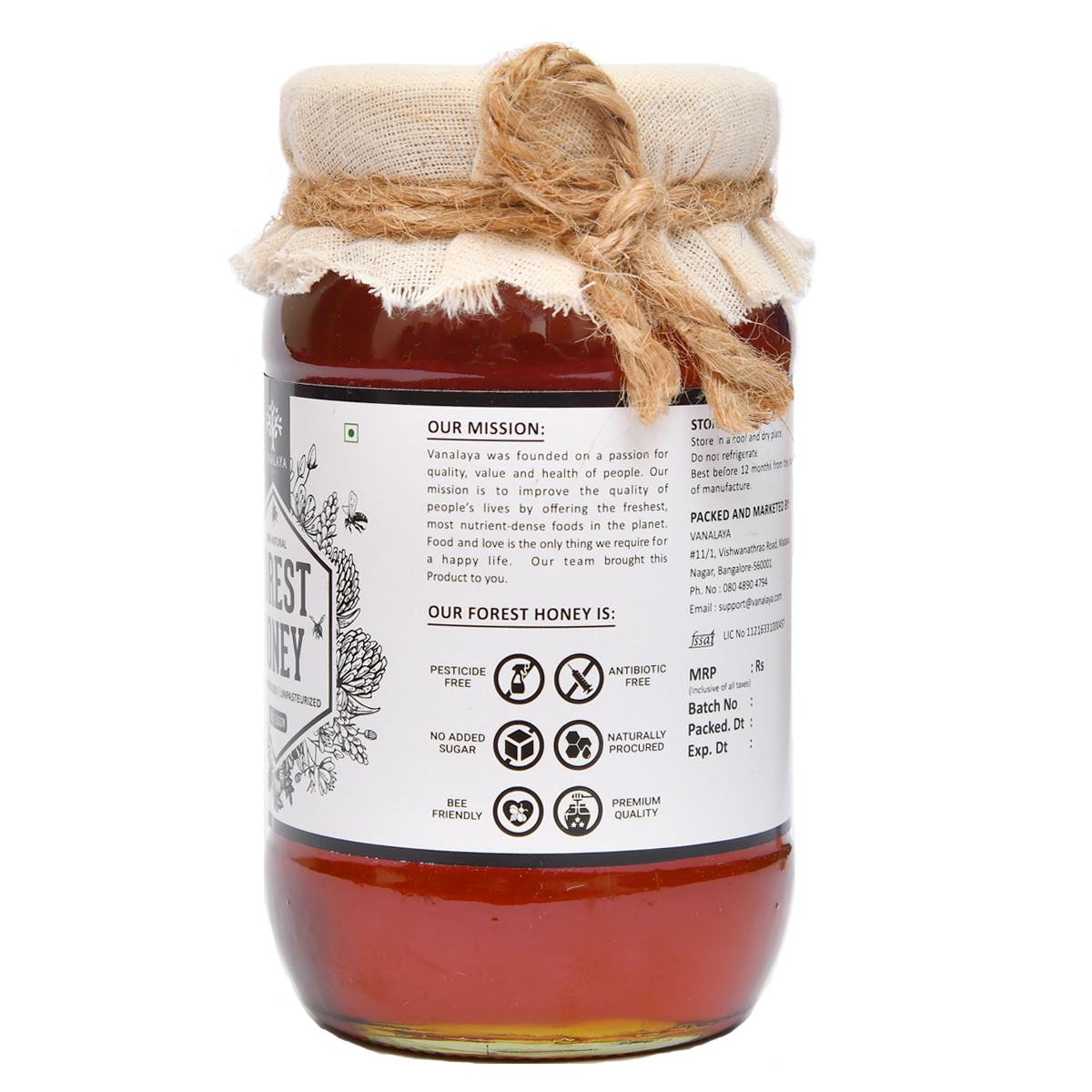 Forest Raw Honey is sourced from the natural beehives up in the trees of forest packed and sold for direct consumption. Fresh from the wild forests of India Vanalaya brings you the finest raw, unheated and unprocessed forest honey. Honey is darker in colour than our regular honey. Honey colour and flavour varies depending on the flowers visited by the honey bees. It is not heated at high temperatures, and the pollen has not been filtered out. Each batch is tested for a high pollen count and a clean read of corn syrup adulteration, pesticides, herbicides and antibiotics before going into your bottle. Regular consumption of Natural Honey helps in Weight Management, Digestion Management, Energy Boosting, Smooth & Glowing Skin, Cold and Cough.