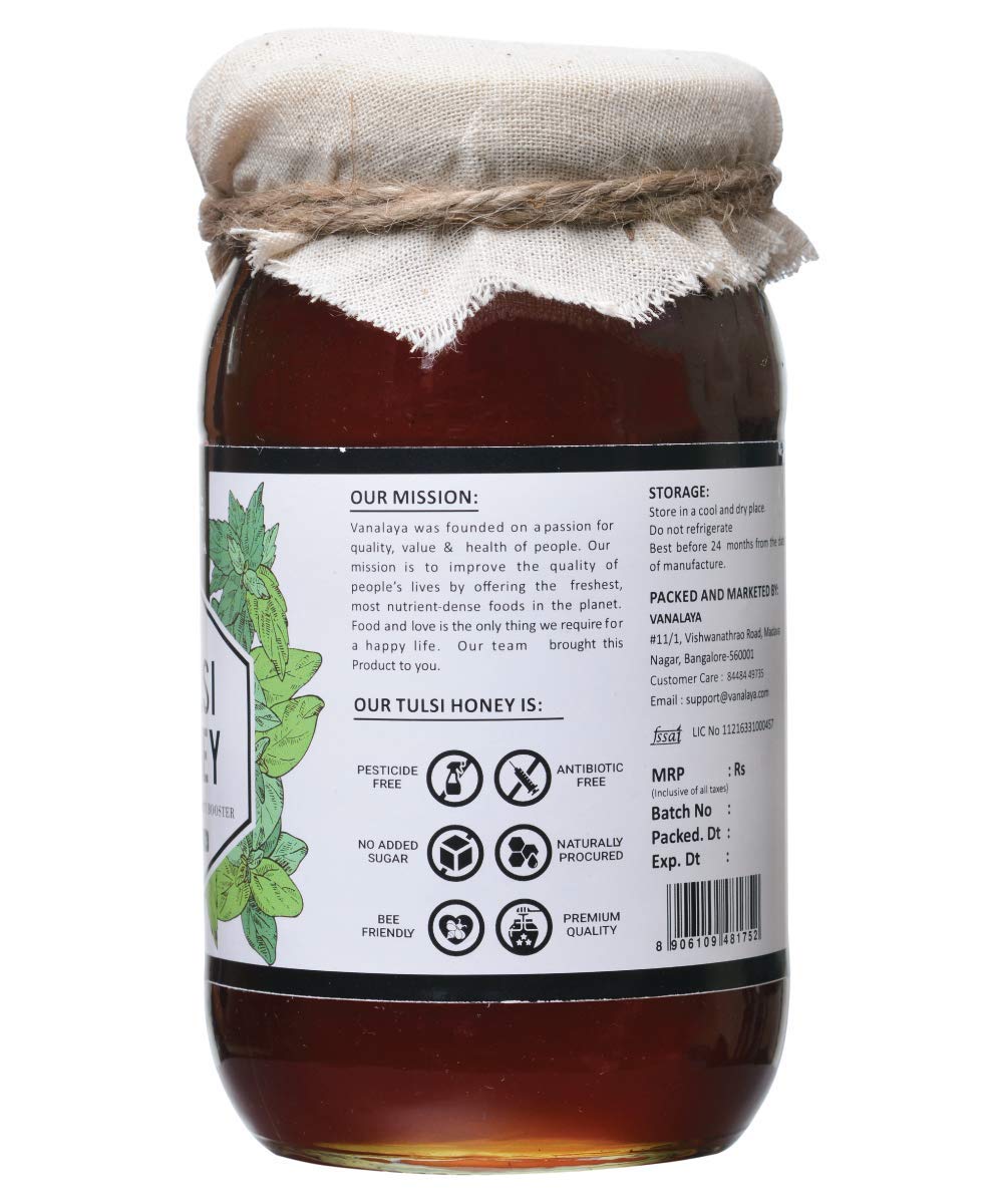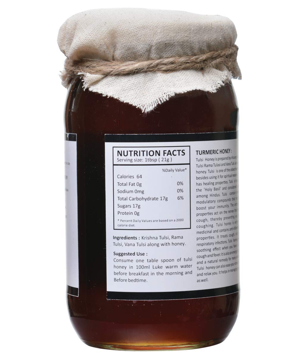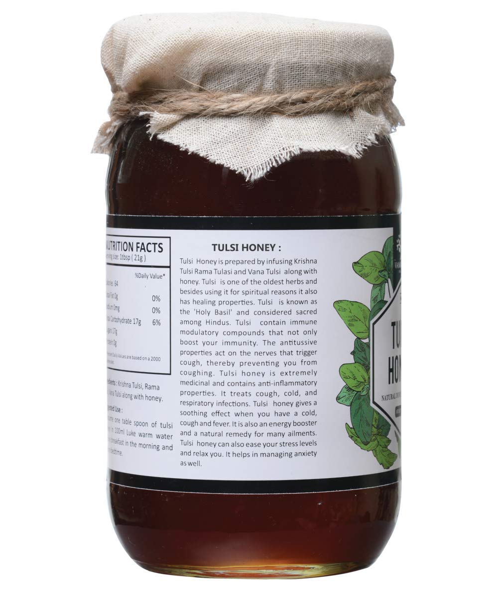 Tulsi Honey is prepared by infusing Krishna Tulsi Rama Tulsi and Vana Tulsi along with honey. Tulsi is one of the oldest herbs and besides using it for spiritual reasons it also has healing properties. Tulsi is known as the ‘Holy Basil’ and considered sacred among Hindus. Tulsi honey is extremely medicinal and contains anti-inflammatory properties. It treats cough, cold, and respiratory infections. Tulsi honey gives a soothing effect when you have a cold, cough and fever. It is also an energy booster and a natural remedy for many ailments. Tulsi honey can also ease your stress levels and relax you. It helps in managing anxiety as well. It is widely used in Ayurveda and is said to offer many benefits from warding off some of the most common ailments, strengthening immunity, fighting bacterial & viral infections to combating and treating various hair and skin disorders