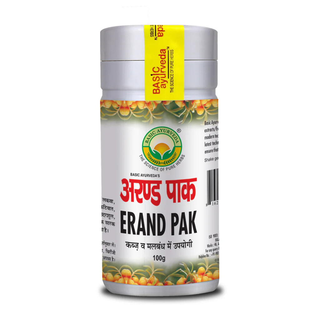 Basic Ayurveda's Erand Pak is an ayurvedic product that is very beneficial in appendicitis, arthritis, colic, lumbago, constipation, inflammation of scrotum, and rheumatism.