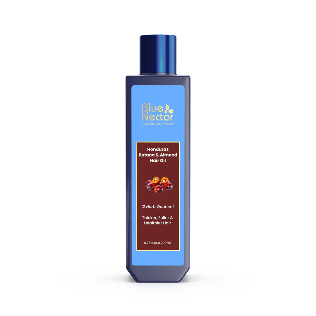 Blue Nectar Batana & Almond Hair Oil is a 100% ayurvedic hair oil for thicker, fuller, & stronger hair. It consists of a wonderful blend of 12 ayurvedic herbs. Batana and Almond hair Oil deeply nourishes hair and help to reduce hair fall while strengthening strands and promoting thickness from root to tip. Batana oil is sourced from the tropical rainforests of Honduras. Whether you have straight, curly, or wavy hair, this nutrient-rich oil is suitable for all hair types, offering essential care for healthier looking and stronger hair.