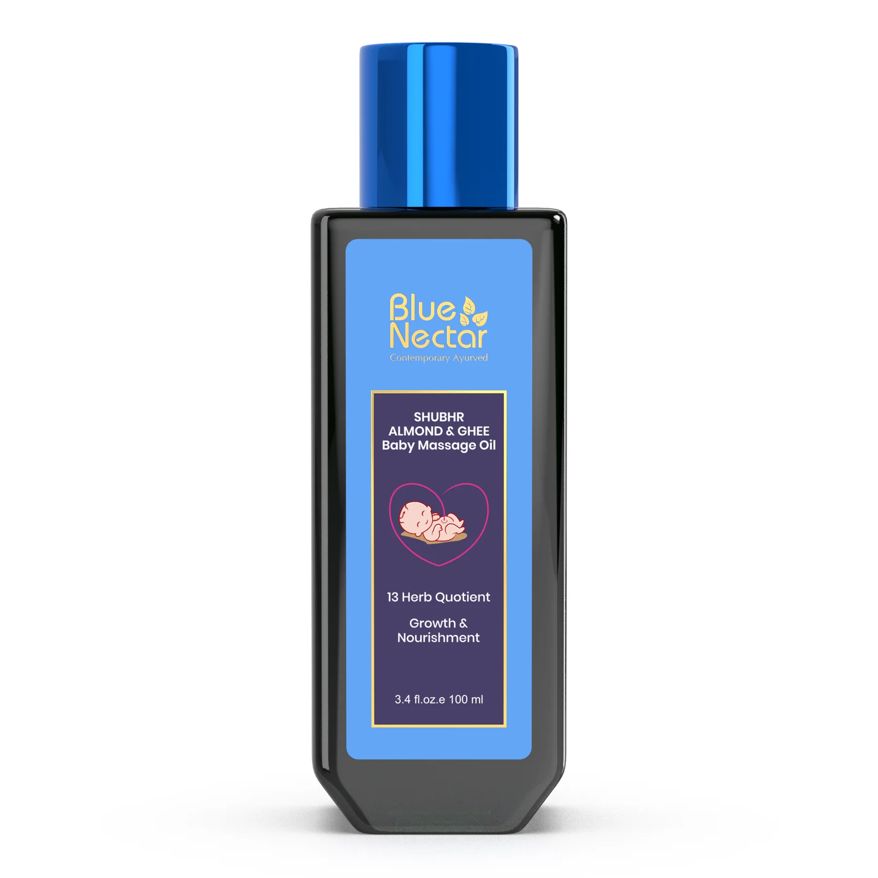 Blue Nectar Baby Massage Oil is made up of 13 Ayurvedic Herbs such as Natural Ghee, Shankhpushpi, Olive Oil, Coconut Oil. This baby oil is specifically designed for the sensitive skin of babies. The combination of oils enriches and enhances the skin of babies, supporting the health of their joints and bones. Regularly massaging your baby with this non-staining, light baby oil will greatly improve your baby's health and overall well-being.