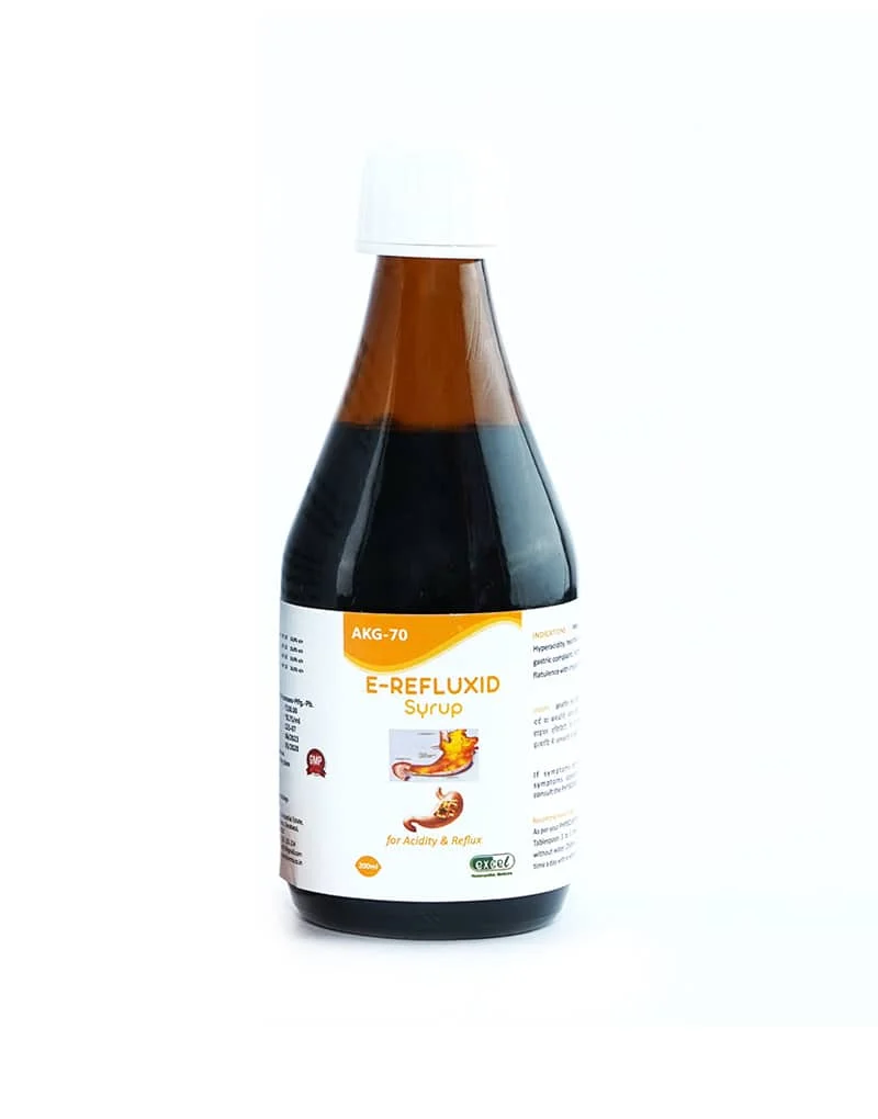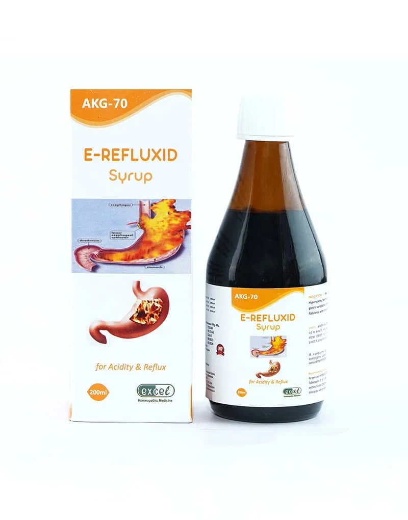 E-Refluxid Syrup is rich in the medicinal properties of Natrum Phosphoricum, carbo vegetabilis, Lycopodium, and Robinia Pseudocacia. It may help in regular or occasional acidity/hyperacidity, GERD, excessive flatulence, and other digestive disorders.