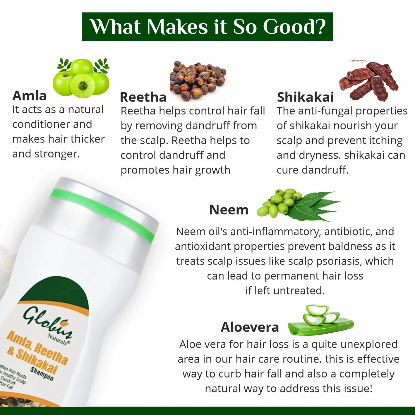 Globus Shikakai hair fall care shampoo is enriched with natural goodness of Shikakai, Amla, Reetha, Giloy, Aloe Vera, Bakuchi. Shikakai acts as a natural cleanser and gently cleanses the scalp. Amla strengthens hair strands, reduces hair fall due to hair breakage and gives voluminous looking hair. Provides wholesome goodness to hair and makes it smooth and soft post wash. Use this shampoo for extra strong, long and smooth hair. Amla ReethaShikakai Shampoo is an all in one solution for lifeless & damaged hair. Enriched with giloy & bakuchi that nourishes and strengthens hair follicles, Shikakai delays premature greying and helps retain natural shine; Aloe Vera that promotes hair growth and helps relieve stress. Regular usage helps radically reduce hair fall retaining natural thickness and shine.