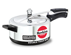 The Hawkins Hevibase Pressure Cooker of commercially pure virgin aluminium is Induction Compatible with an external bottom plate of AISI 430 grade magnetic stainless steel attached to the double thick base. It can safely be used on all domestic gas, electric, halogen, ceramic, and induction cooktops.The double-thick, heavy gauge base is ideal for light frying before pressure cooking. The base stays flat, never bulges. Suitable for gas, electric, ceramic and halogen cooktops.A version of this model with a fully hard anodised double thick base was available as the Hawkins Ekobase. This was suitable for domestic gas, electric, halogen, ceramic but not for induction cooktops.