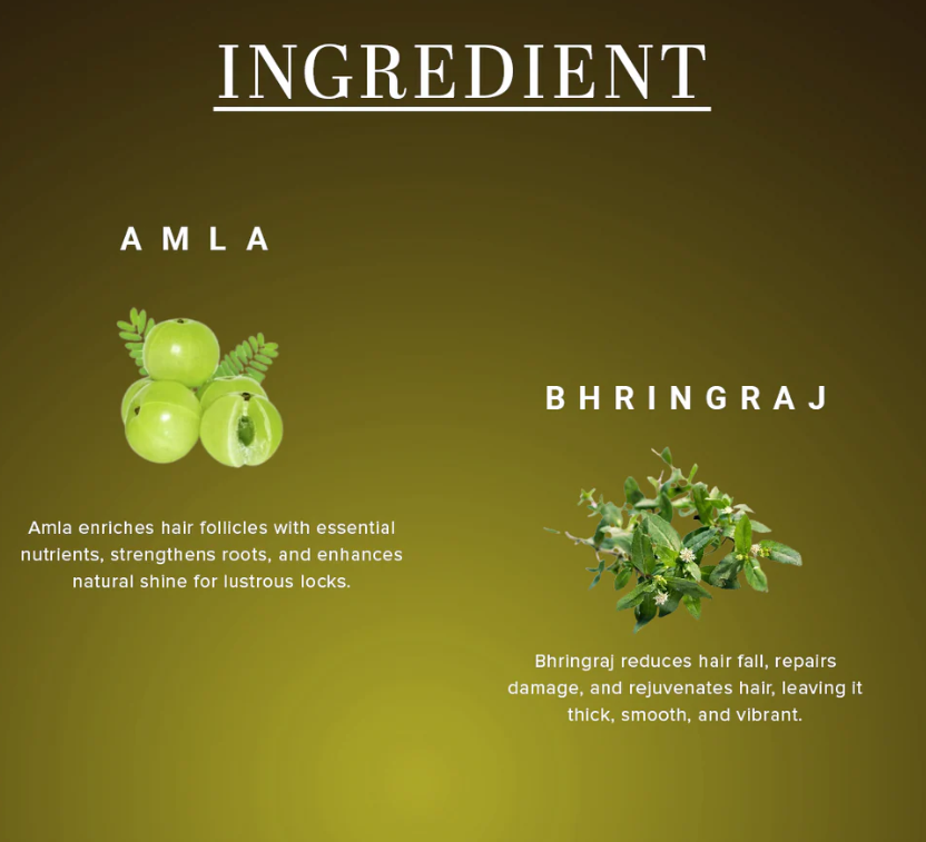 Amla Ext. (Phylanthus emlica ), Bhringraj Ext. (Eclipta alba), Cannnabis sativa seed Ext., Lavender oil, Rosmary oil (Rosamerinus officinelis), Hydrolised keratin, Neem oil (Azadirachta leaf Ext.), Zinger Ext., D-Panthenol, Jojoba oil, Argan oil, Polyquaternium-10, Lauryl Glucoside,Sodium Gluconate, Cetyl Alcohal, Almond oil, Olive oil, Tocopheryl Acetate, Cetearyl Alcohol, Glycerine, Sodium Benzoate, Ethyl Hexyl Glycerine, Fragrance Essential oil.