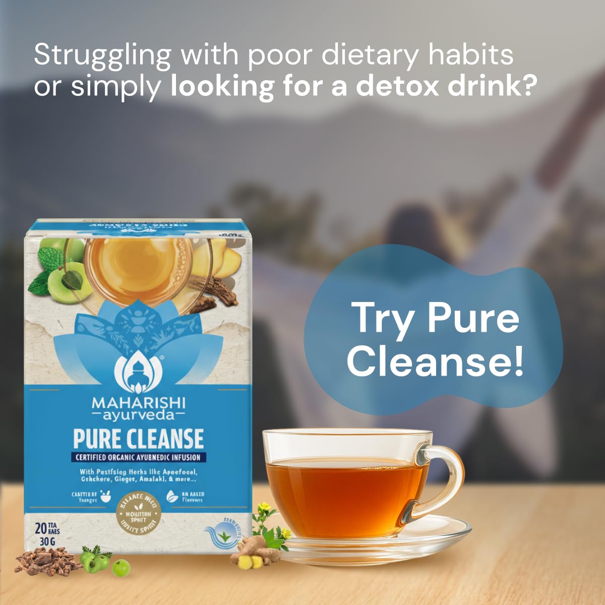 Pure Cleanse harnesses the wisdom of Ayurveda to gently support your body’s innate detoxification process. This organic blend of Anantmool, Ginger, Amalaki, and purifying herbs combats Ama (toxins) from a poor diet or stress, reigniting agni (digestive fire) and enhancing ojas (vitality). With every minty-spiced sip, reawaken your body’s natural purification no additives, just natural herbs in your cup.