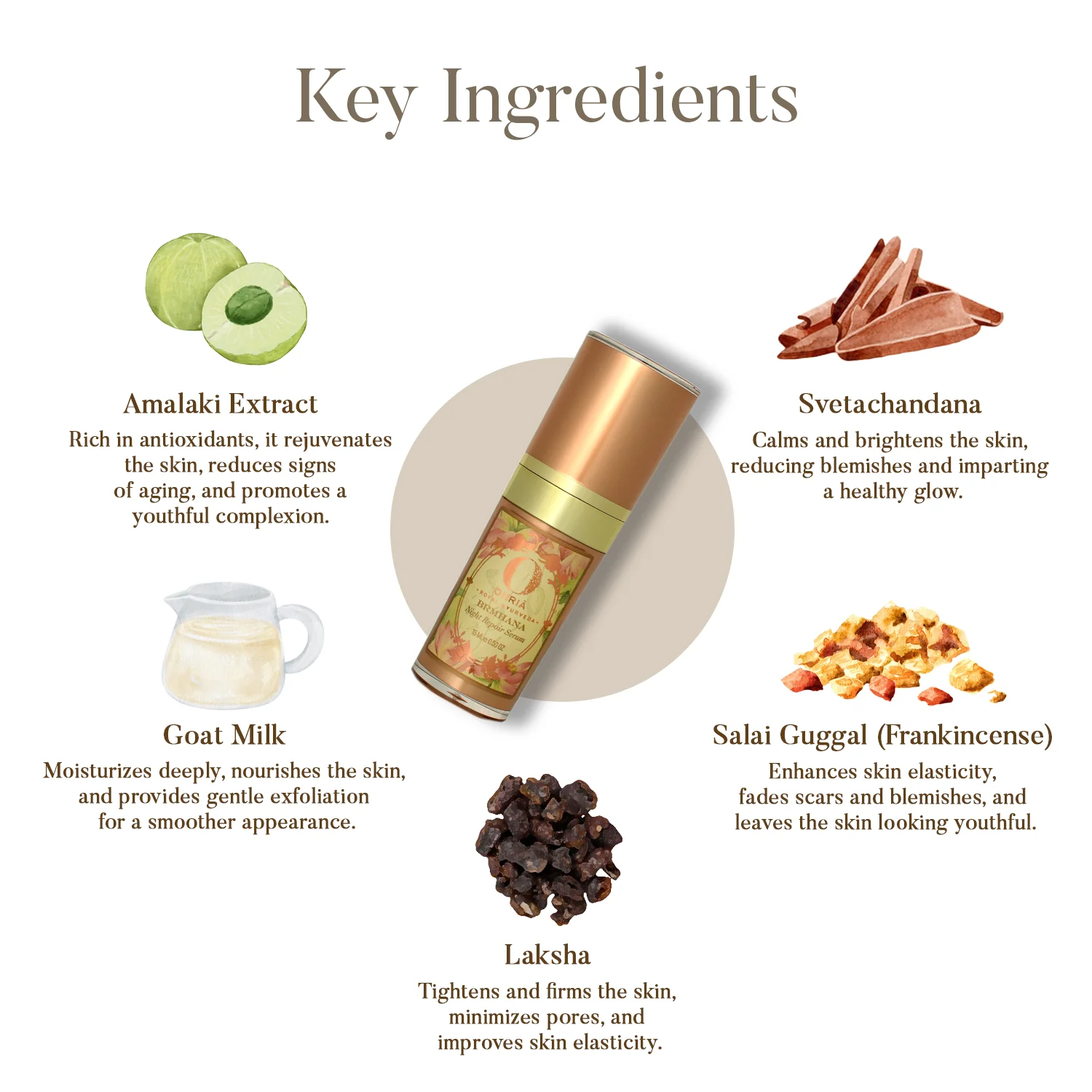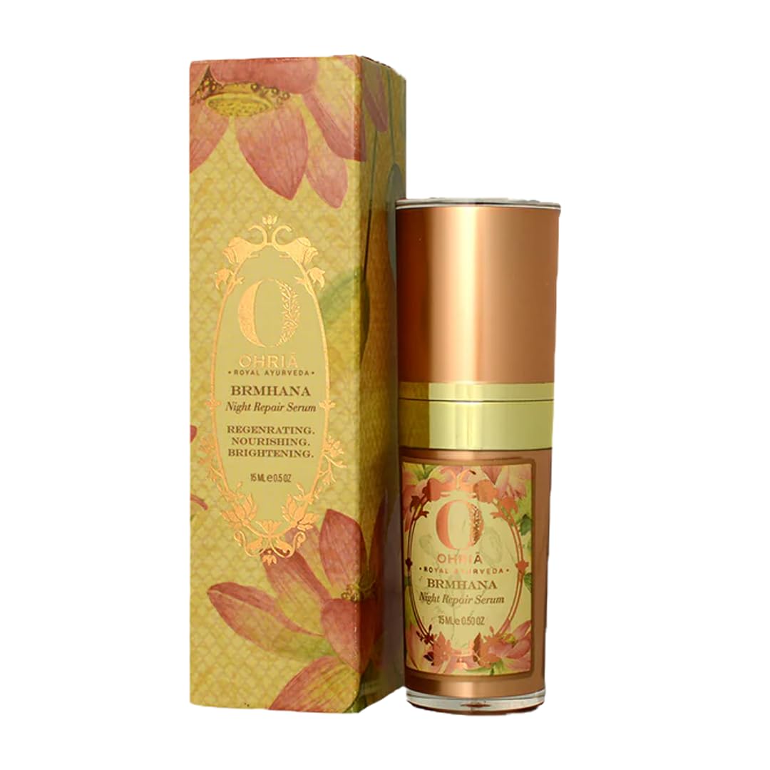 The Night Repair Serum is a 100% natural, anti-aging formula designed to regenerate, nourish, and brighten the skin. A highly potent formula has a base of kumkumadi oil, botanical extracts in goat's milk, blended with antioxidants and botanical extracts, of Carrot Oil (Vitamin A), Amla (Vitamin C), and Wheat Germ Oil (Vitamin E). It enhances the complexion with pure Kashmiri Saffron and Ghee. Essential oils of Frankincense and Rosewood work to delay aging, tighten skin, and reduce scars. Ohria’s advanced serum penetrates deeply into facial tissue, leaving skin soft, supple, and healthy from within. A base of kumkumadi oil in this serum.