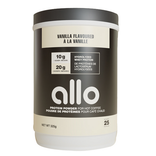 Allo's vanilla protein powder, non-creamer seamlessly mixes into your hot beverages with an aromatic subtle vanilla flavour. Boost any hot (or cold, iced) beverage with allo. vanilla non-creamer will maintain the integrity of your black coffee while adding 10g or 20g with 2 scoops of high whey protein. Ingredients: Hydrolyzed Whey Protein Concentrate, Natural Flavours, Soya Lecithin.