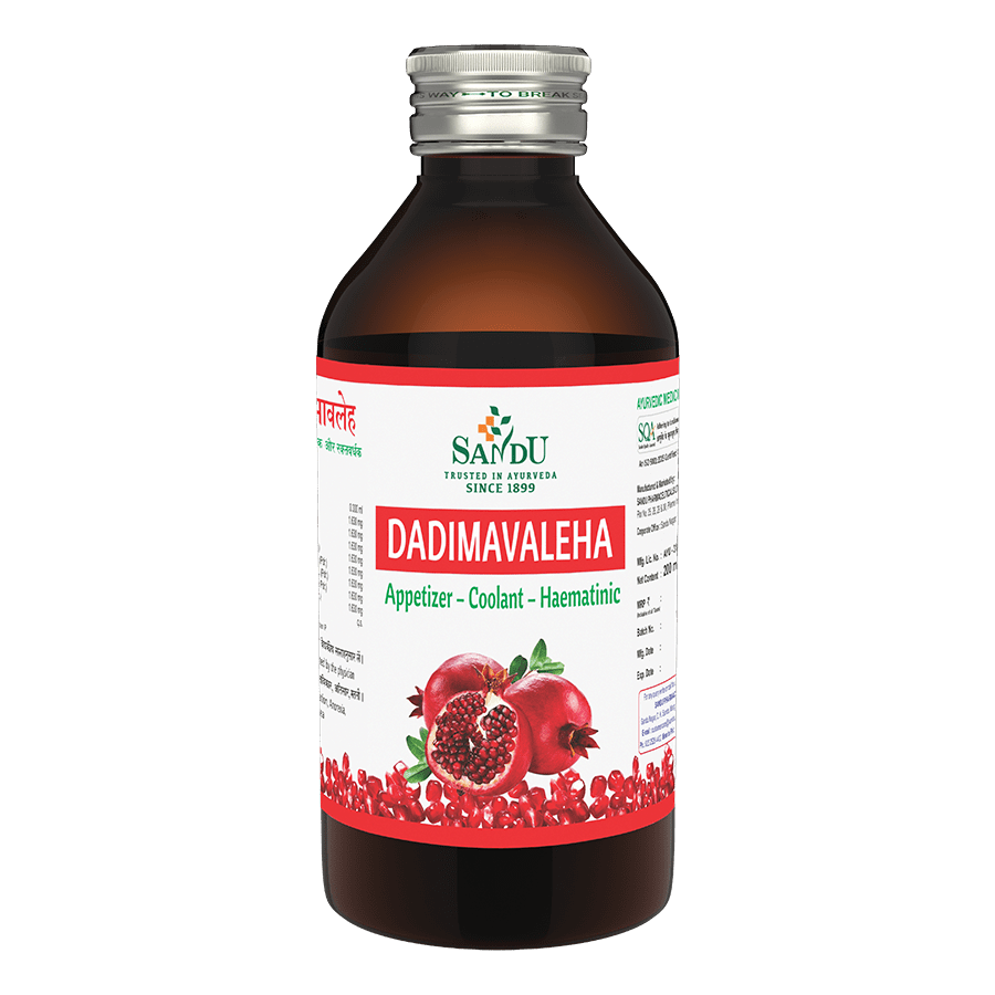 Dadimavaleha is an excellent medicine useful in balancing pitta-related disorders. It neutralises excessive acids in the stomach thereby helping with acidity and hyperacidity. Its cooling effect on the stomach provides relief from various symptoms of hyperacidity. It acts as an appetizer and improves the desire to eat food. The presence of pomegranates (Dadima) helps increase iron absorption and increases haemoglobin count in the blood. Trikatu – a powerful blend of ginger (adrak), black pepper (kali mirch) and long pepper (pippali) is very rich in antioxidants and is a strong alpha-glucosidase inhibitor which keeps the amount of glucose in your blood from going up too fast after you eat. It is also beneficial for pregnant women and can help relieve nausea and morning sickness.