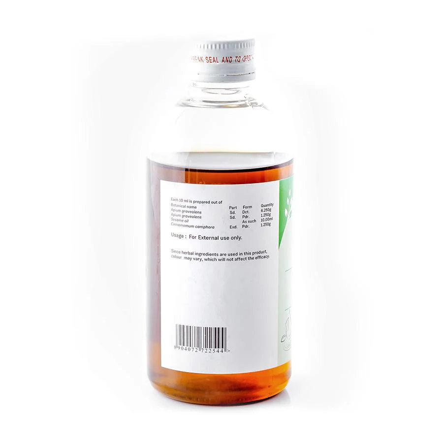A popular yoga from the Sahasra Yoga, Taila Prakarana, Karpooradi Thailam is widely used for its acute pain-relieving properties. It is simple preparation of sesame oil infused with the potent anti-inflammatory properties of Ajamoda (Trachyspermum roxburghianum) and Camphor (Cinnamomum camphora). Abhyanga or ‘massage’ is an important part of the Dinacharya (Daily routine) prescribed by Ayurvedic literature. Scriptures suggest the use of suitable oils massaged in the direction of hair growth and around joints, to pacify aggravated doshas and maintain balance. Karpooradi Thailam is ideal for the winter months when the ‘Vata’ element is aggravated in the body and manifests as aches, pains and rigidity all over the body. Karpooradi thailam is a pain-relieving oil. It may be used on its own or in combination with other treatment methods. Karpura (camphor) is the central ingredient used in the oil. It is blended along with Ajamoda and other herbs in a sesame oil base.