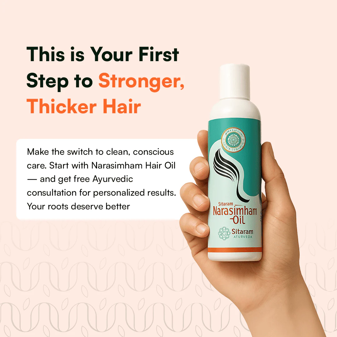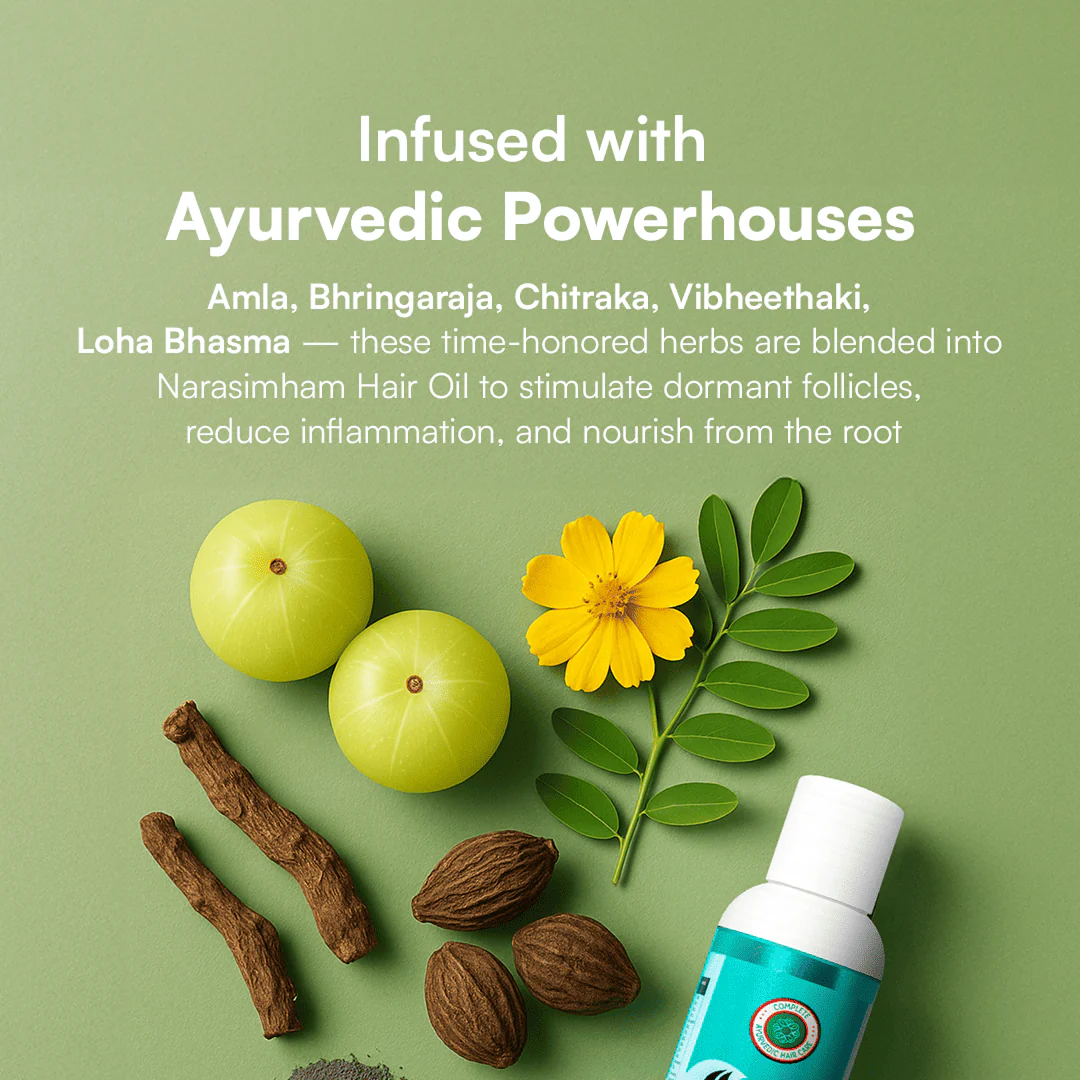 Narasimham Hair Oil is a revitalizing Ayurvedic blend derived from the Rasayana tradition, specially formulated to nurture hair health while promoting holistic well- being. This unique oil brings together powerful herbs and minerals like Amla, Bhringaraja, and Asana, blended in a deeply hydrating coconut oil base. This time-tested formula activates and revitalizes the cells in your scalp and hair follicles, encouraging healthy hair growth, deep hydration, and an improved mind- body balance. Ideal for men and women alike, Narasimham Oil extends beyond hair care, soothing the senses and releasing tension.